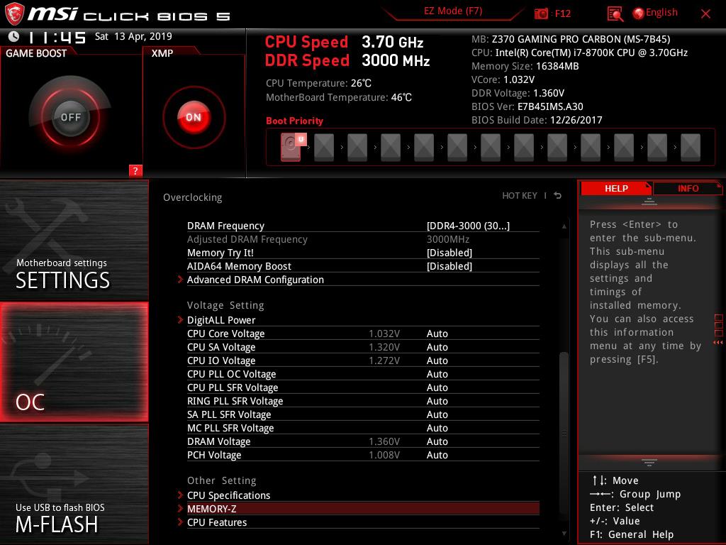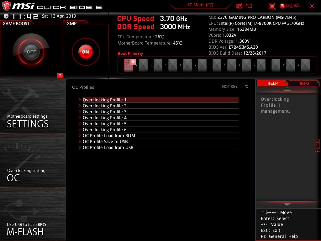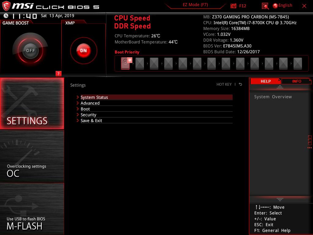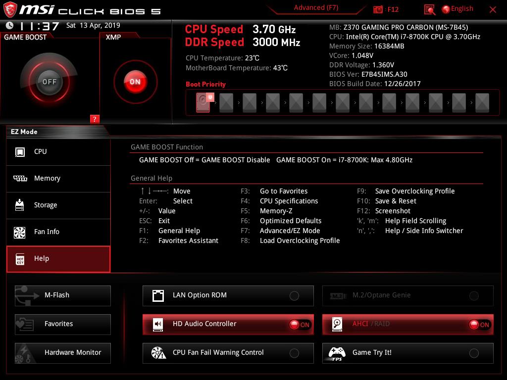 Help will show the list of the shortcuts and their descriptions. In order to take the snapshot of the BIOS current interface, the user is required to press F12. The FAT32 file system is needed on the USB flash drive without which the snapshot won’t be saved. The default file format of these pictures is BMP (Bitmap) which is quite obvious. Notice that, the system is displaying that our Intel i7 8700k could be set at 4.8GHz in the Game Boost mode. This is based on their own algorithm and related settings. The user can still manually overclock the CPU. I am using the same chip that has been used for testing of the other Z370 chipset motherboards and it has achieved 5.0GHz on all. 5.1GHz is also feasible for our chip subject to the adequate cooling solution. I am mentioning this to let the users know that 4.8GHz is not the limit of the chip.