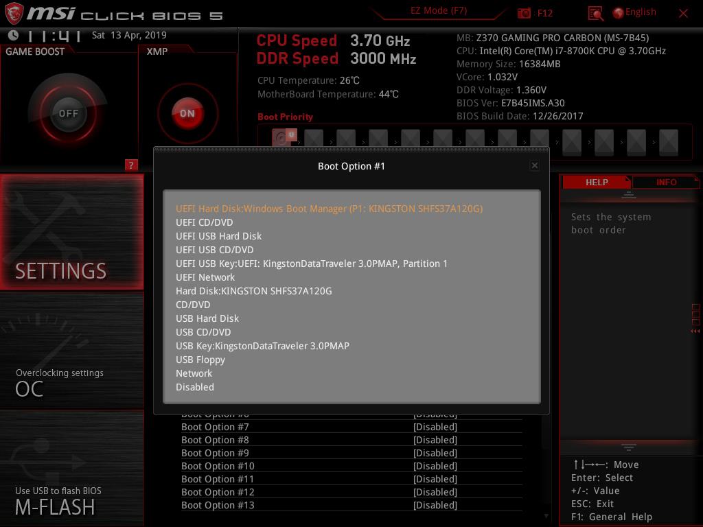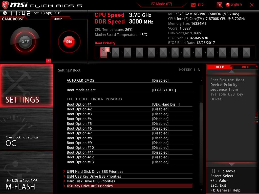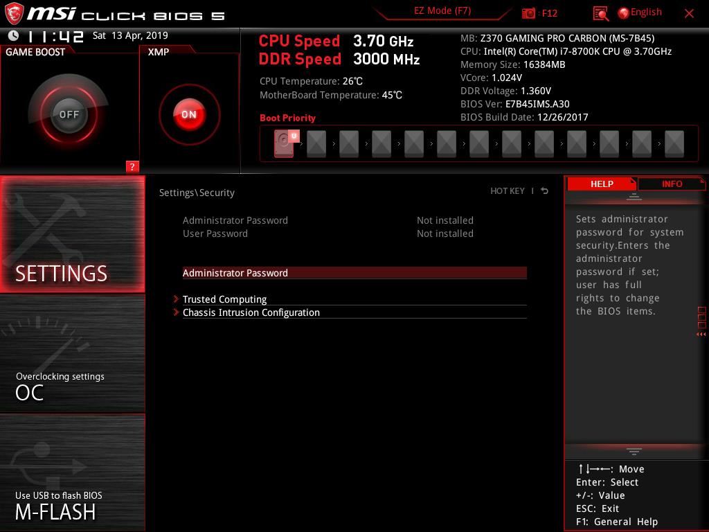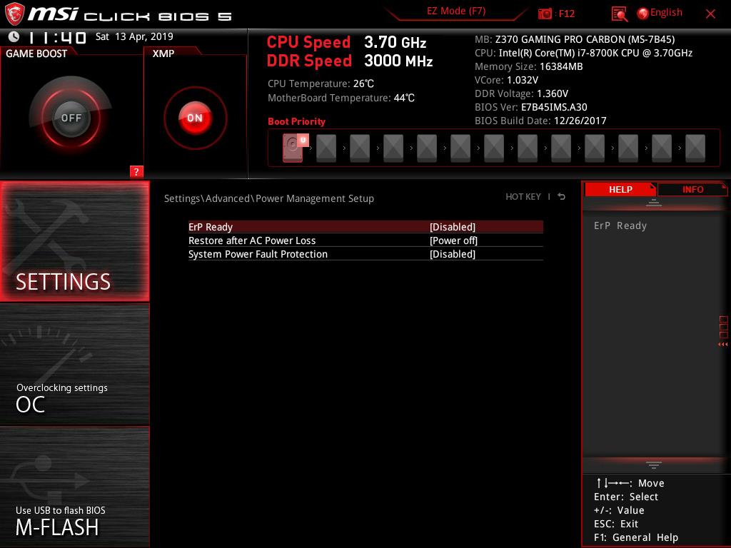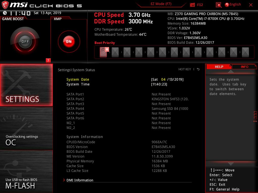 Help will show the list of the shortcuts and their descriptions. In order to take the snapshot of the BIOS current interface, the user is required to press F12. The FAT32 file system is needed on the USB flash drive without which the snapshot won’t be saved. The default file format of these pictures is BMP (Bitmap) which is quite obvious. Notice that, the system is displaying that our Intel i7 8700k could be set at 4.8GHz in the Game Boost mode. This is based on their own algorithm and related settings. The user can still manually overclock the CPU. I am using the same chip that has been used for testing of the other Z370 chipset motherboards and it has achieved 5.0GHz on all. 5.1GHz is also feasible for our chip subject to the adequate cooling solution. I am mentioning this to let the users know that 4.8GHz is not the limit of the chip.
