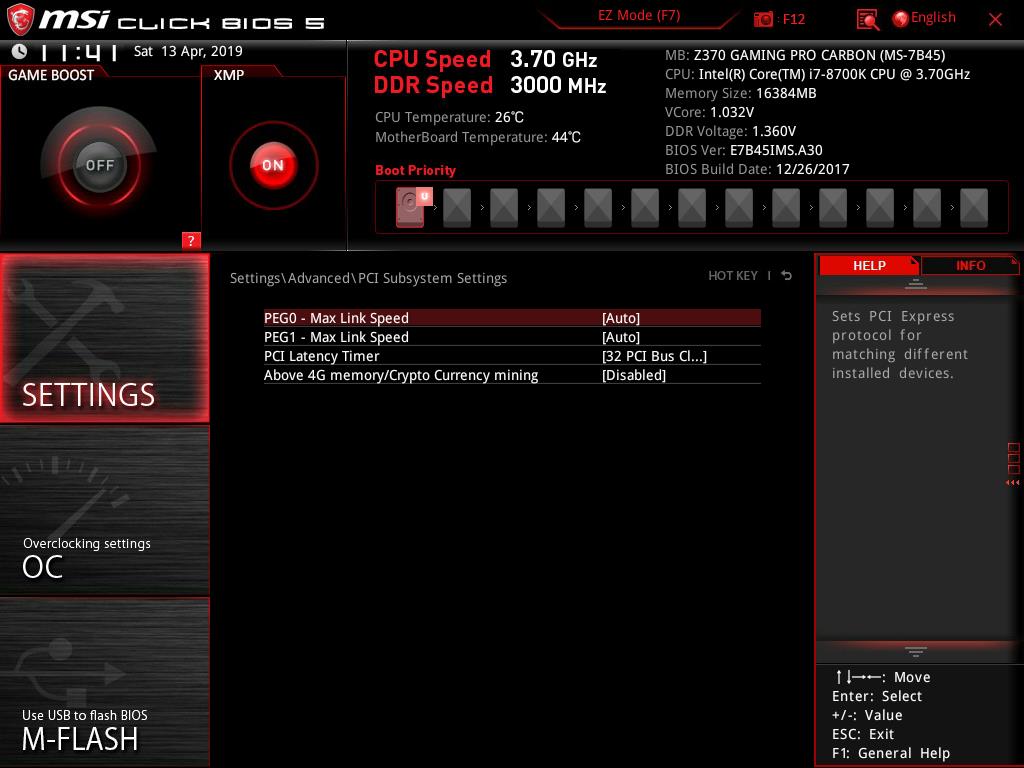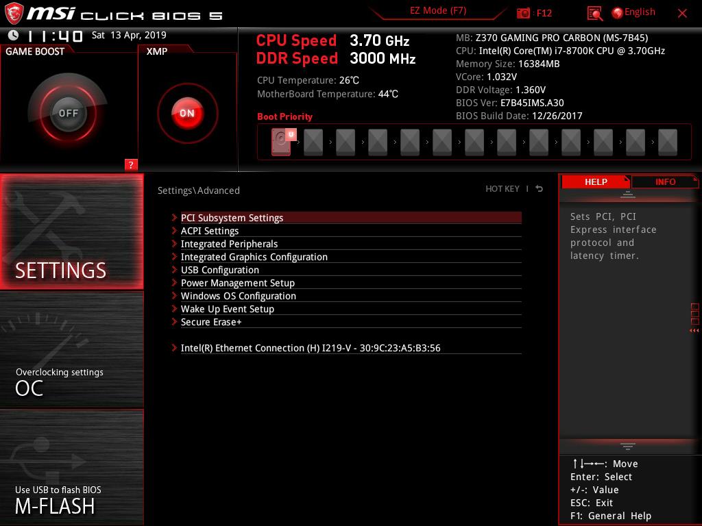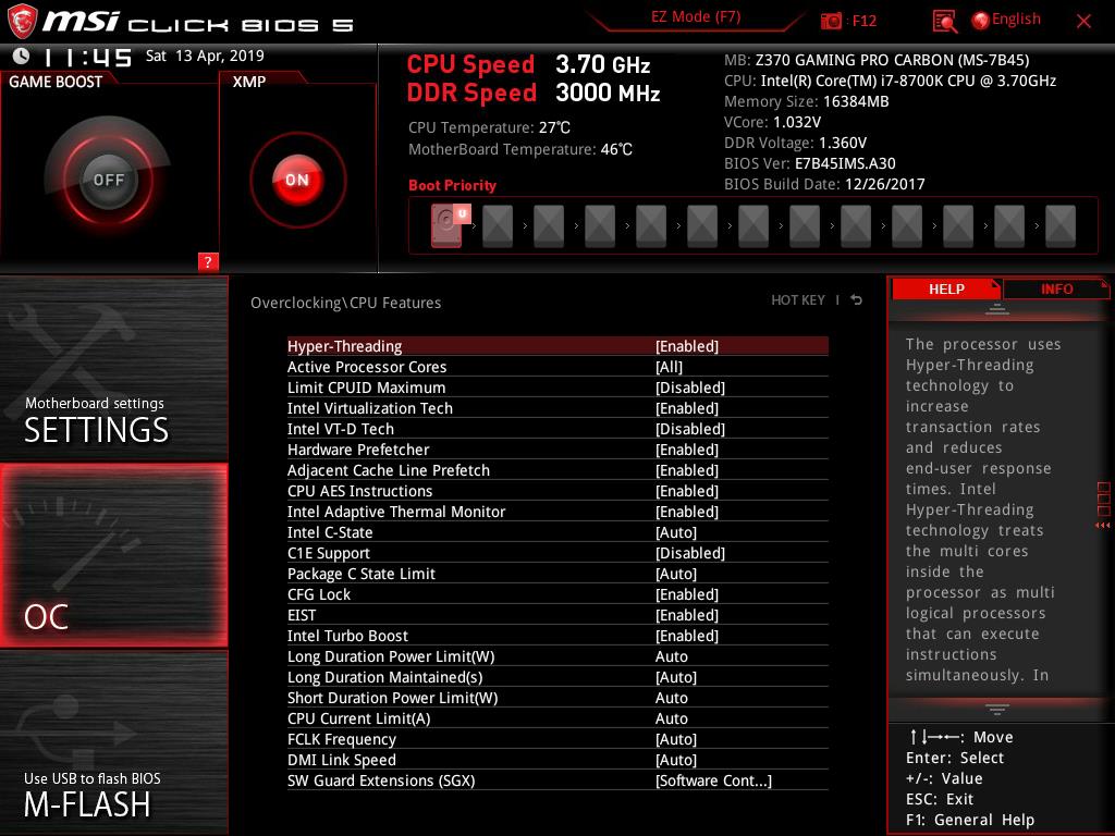 The MSI Z370 Gaming Pro Carbon is using Click BIOS 5. The BIOS is UEFI AMI one using ACPI 6.0, and SMBIOS 3.0. There is a single 128 Mb flash chip hosting the BIOS. There is no dual BIOS on this motherboard. Multi-language support is available in the BIOS.