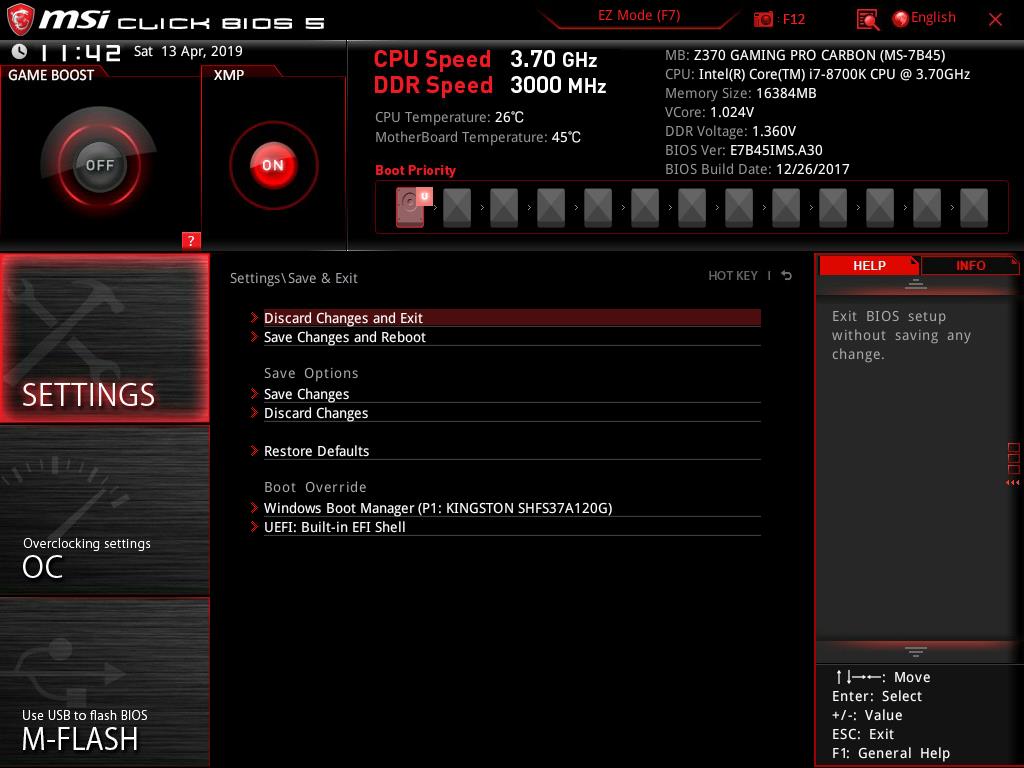 The save and exit options are located under the Settings menu. As can be seen, the Settings menu is comprehensive and covers almost all the major system configuration settings that the user would need.