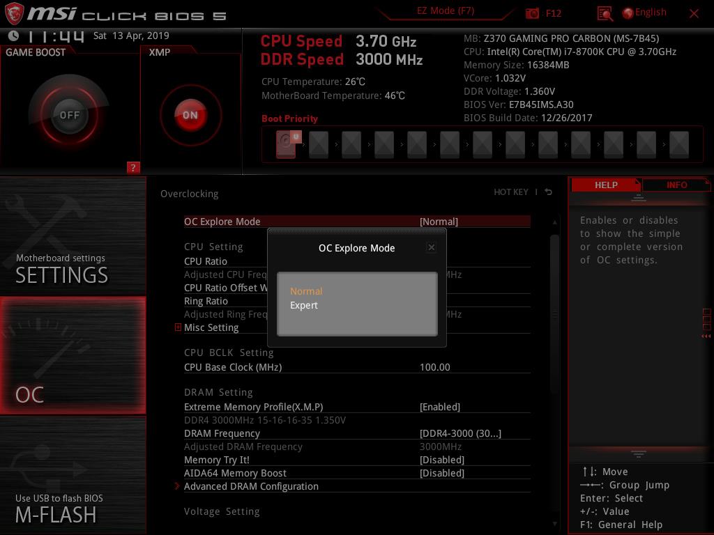 I have been saving the main section related to the overclocking settings for the last. Clicking the OC button on the left side of the main interface will load options that the user can use to control the voltages, frequencies, XPM settings to name a few. OC Explorer Mode has two options; Normal, Expert. We have CPU related settings, DRAM related settings, Voltage related settings here.
