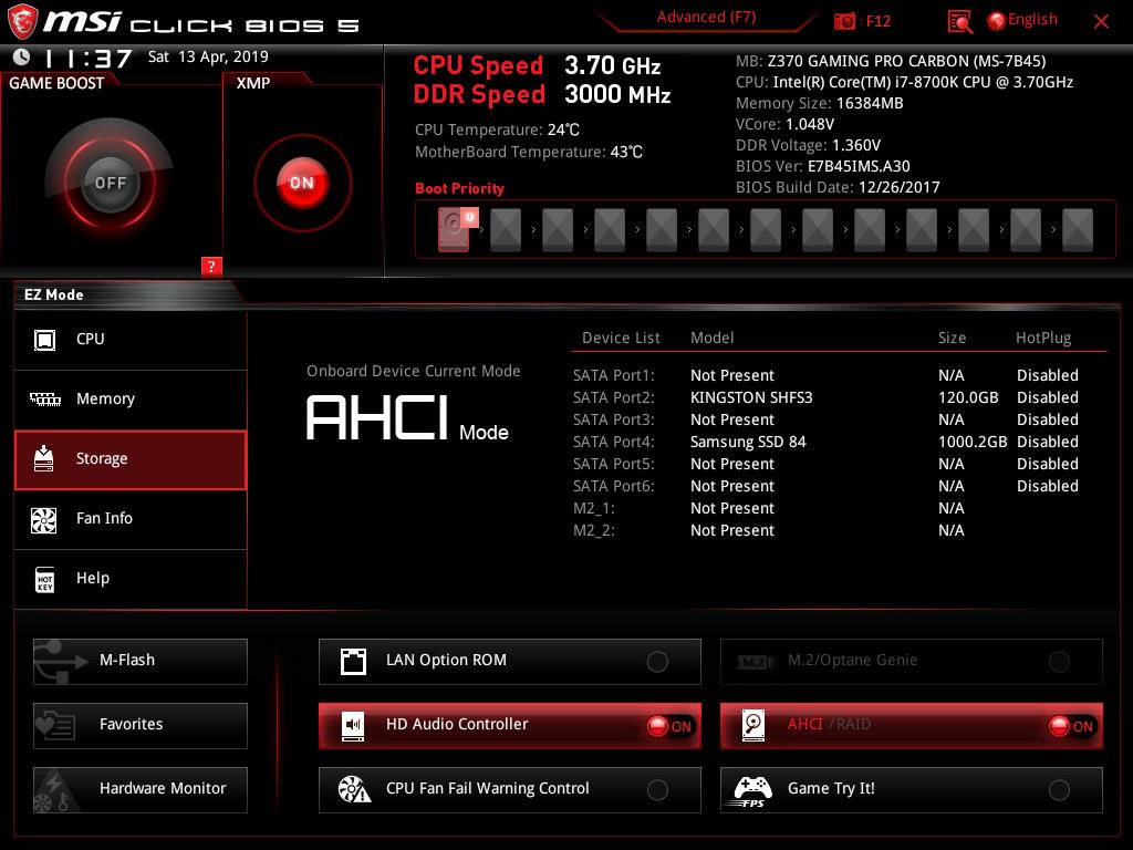 The storage will list the connected the SATA devices on the corresponding SATA ports. AHCI is the default onboard device mode.