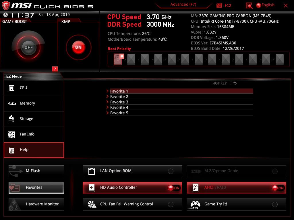 We have more option buttons at the bottom pane of the EZ mode. Clicking on the Favorites will load the list of the saved Favorite settings. The user can save up to 5 different Favorite lists with each having its own corresponding settings. The idea of Favorite is to readily access the frequently used settings. The user can disable/enable the onboard HD Audio controller, AHCI/RAID, select/deselect the M.2/Optane Genie and other settings, etc.