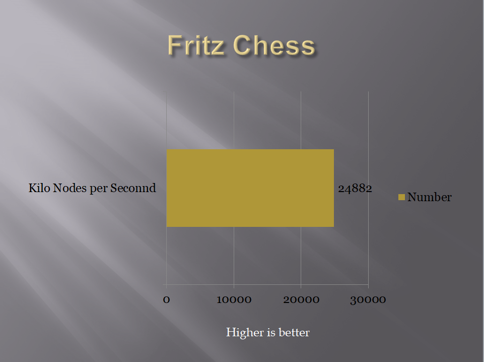 Frtiz Chess Benchmark is a CPU Performance test. It puts the CPU at 100% utilization and scales among the cores and the threads. The score is recorded as Kilo Nodes per Second and Relative speed.