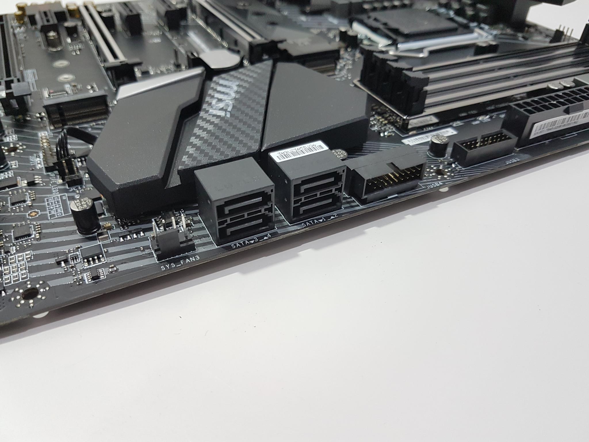 There are two USB 3.1 headers on the left side of the ATX power connector. One of these is implemented in 90° angle. They are labeled as JUSB3 and JUSB4. Next, to them, we have 4 SATA ports labeled as SATA 1_2 and SATA 3_4. These are rated 6 Gbps. The motherboard supports RAID 0,1,5, and 10. On their left side, we have a Sys_Fan3 PWM header.