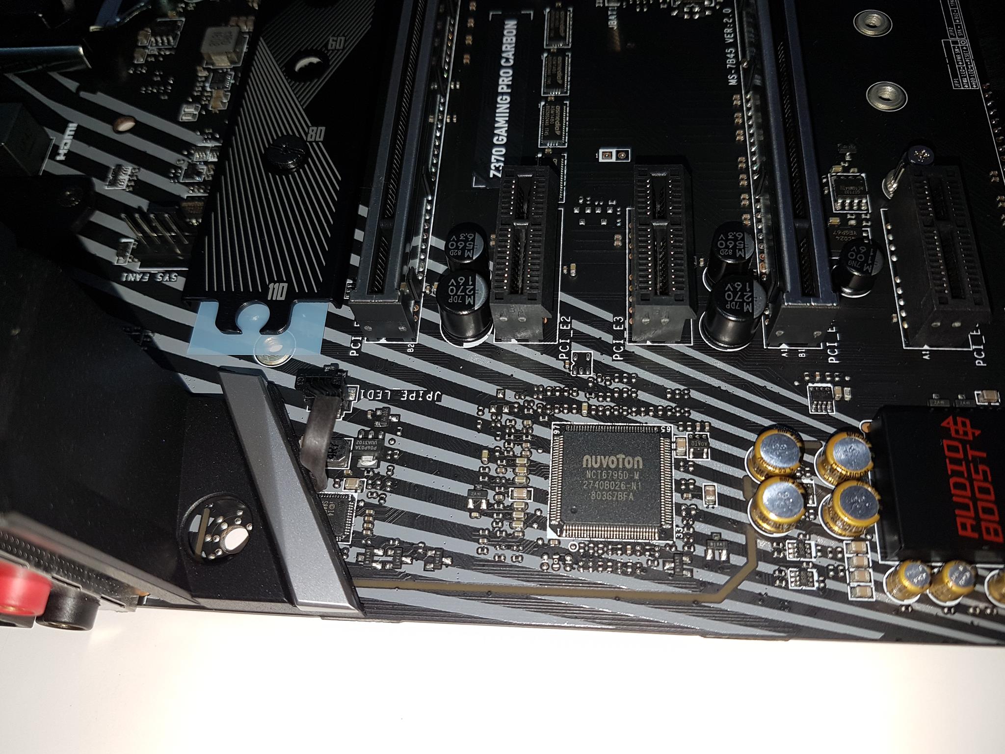 The MSI Z370 Gaming Pro Carbon motherboard is using Nuvoton NCT6795D-M as a super I/O controller chip. The Nuvoton 3947SA chips are located next to each fan header.
