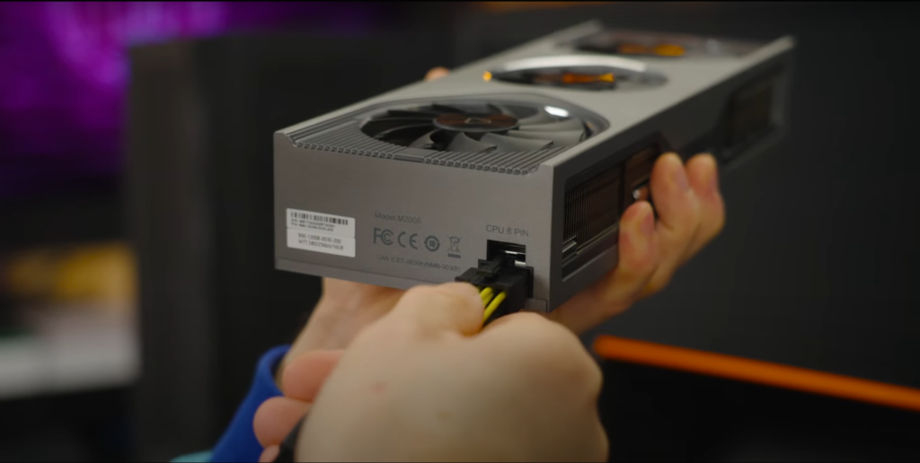 On unboxing the GPU, Linus found that the MTT S80, rather than using a standard PCIe power connector, uses an adapter that goes from 2x PCIe 8-pin to an 8-pin EPS. The EPS connector is actually used to supply power to a CPU, not a GPU.