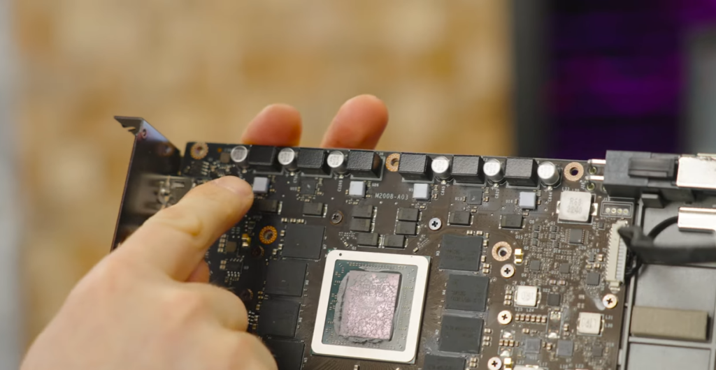 The VRMs or Voltage Regulator Modules are built on top of the GPU board, which is quite surprising. The GPU die is surrounded by 8 VRAM chips (2GB each) labeled ‘Samsung’.