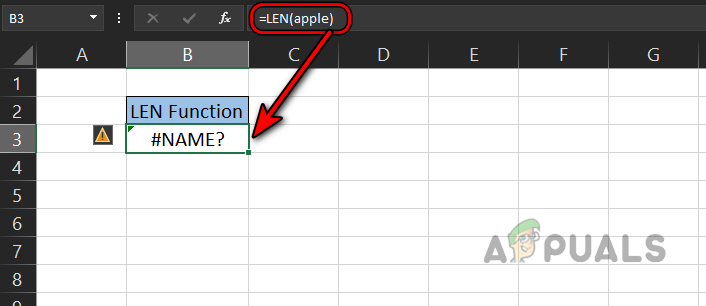 - In the sheet shown in the image below, our LEN(apple) formula in cell B3 is showing a #name error.