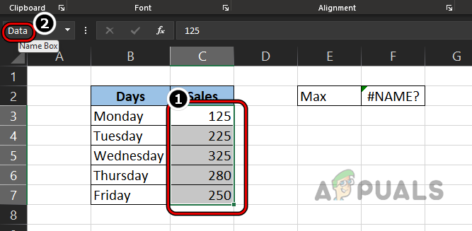 #Name Error Due to Error on Another Formula - Then edit the formula of the Max function to use the correct Range name as Data and afterward, the #name error will be cleared from the half of the max cell.