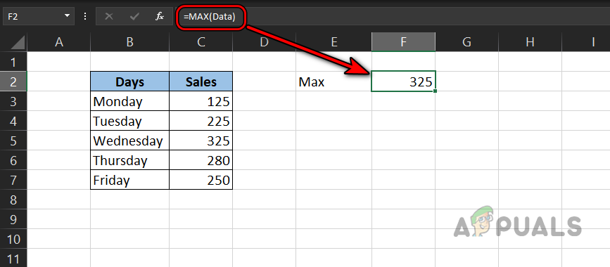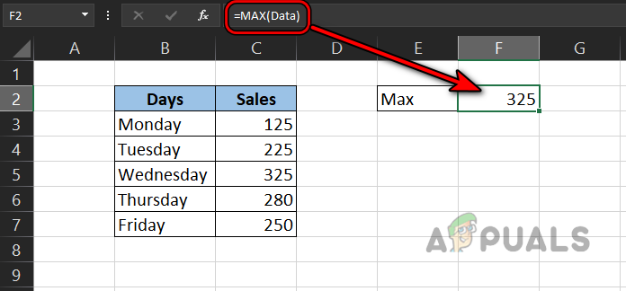 Name the Range as Data - Then enter the name as Data and let’s find the Maximum sale by using the Max formula like: