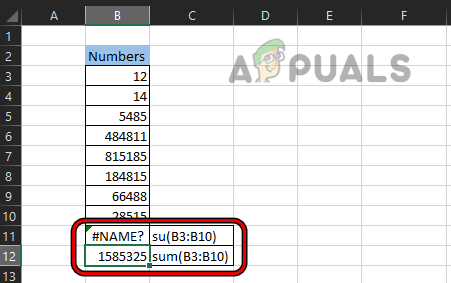 To better understand the concept, have a look at the image below in which Excel is showing a #name error in cell B11 and the formula used in su(B3:B10). As we all know, there is no Excel function su, so, Excel threw the #name error.