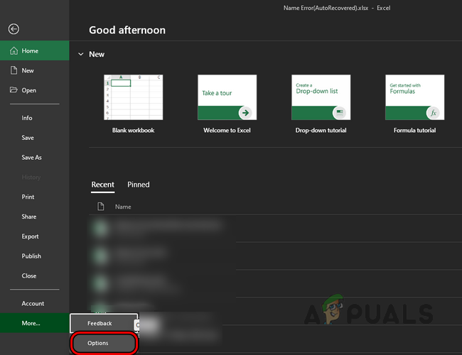 - To clear the #name error in this case, you must install the add-in, and do so, head to the File tab of Excel, and expand More.