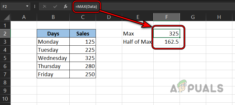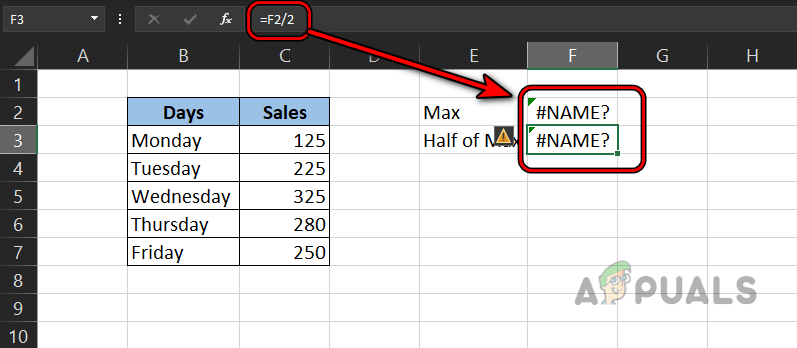 - Now let’s try to calculate half of the Max in the F3 celland you will see that this formula also throws the #name error whereas, there is no mistake in the formula. It is only occurring due to the #name error of the Max function in the F2 cell.