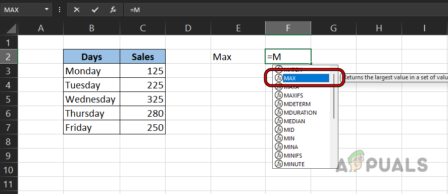 - Then press the M key and in the suggestions shown, double-click on Max.