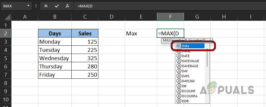 Select the Max in the Formula Assistant - Now type D and in the suggestions shown, double-click on the Data (range name).