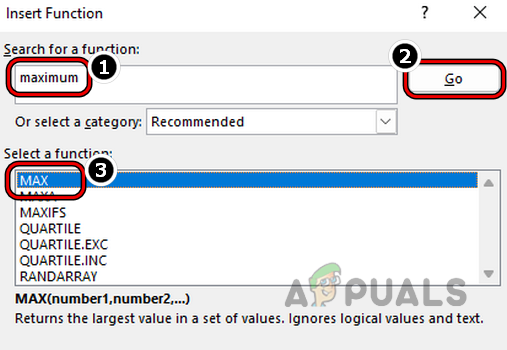 Click on Insert Function on the Formula Tab - Now search for the function that you want to use like Maximum and click on Go. You can also set the Category dropdown to all (or to a required one like Statistical) and scroll through the functions to find the required formula.