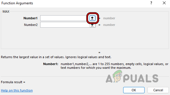 Search and Select the Max Function in the Insert Function Menu - Now click OK and then, click on the Up Arrow sign corresponding to Number 1.