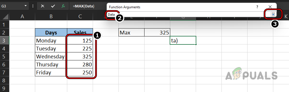 Select the Data Range in Max’s Function Argument - Now click on the Down Arrow in the Functions Arguments menu and click OK.