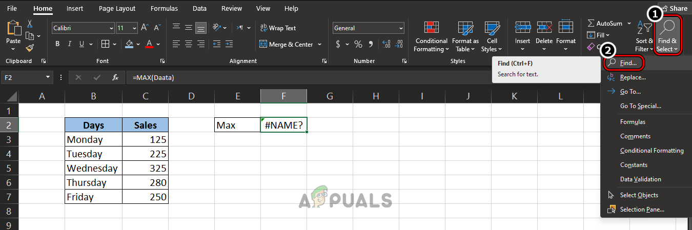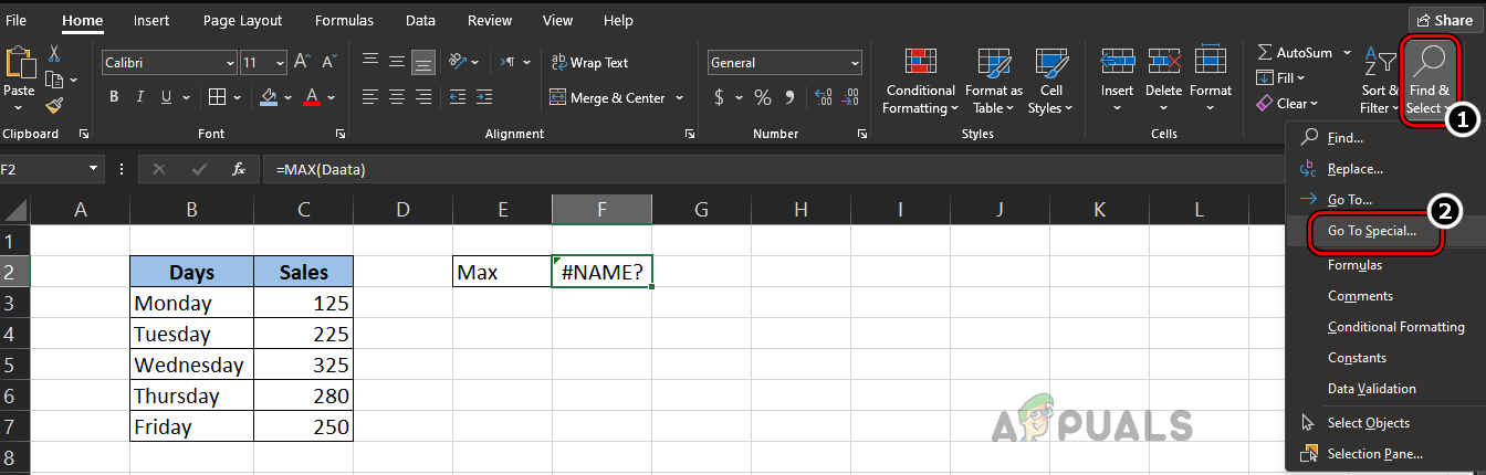 - Open the problematic sheet and expand the dropdown of Find & Select in the Editing Group on the Ribbon’s Home tab.