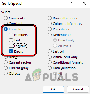 - Now open Go To Special and then select the radio button of Formulas.