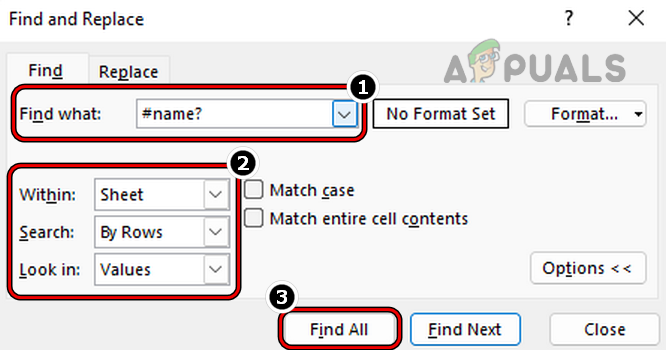 Find for #Name and Set its Look into Values - Now click on Find All and all the cells with the #name error will be available to you.
