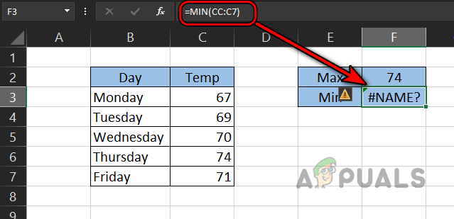 - Now we have set up two formulas to find out the Max and Min temperatures but the Min temperature in cell F4 is showing a #name error.