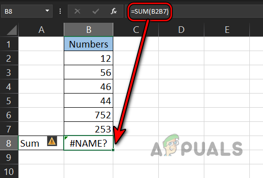 - Look at the sheet in the image below and you will notice a #name error in the B8 cell where we wanted to sum up the B2 to B7 cells.