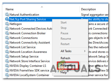 Several affected users were previously dealing with the same error associated with the Net.Tcp Port Sharing service has reportedly managed to fix the problem by using the Services screen to change the default behavior of this service.