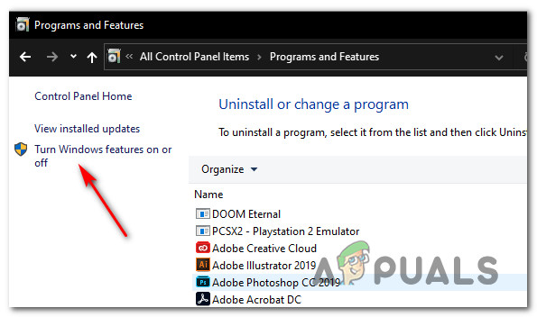 Opening the Programs and Features screen - Once you’re inside the Programs and Features screen, click on Turn Windows features on or off. When prompted by the UAC (User Account Control) window, click Yes to grant admin access.
