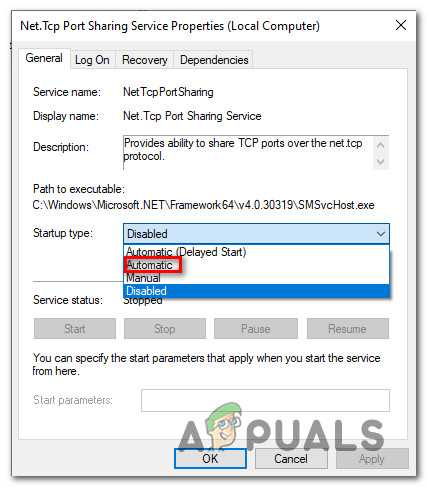 Accessing the Properties screen of Net.Tcp Port - Inside the Properties screen of the Net.Tcp Port Sharing service, click on the General tab from the menu at the top, then access the drop-down menu of Startup type and set it to Automatic.