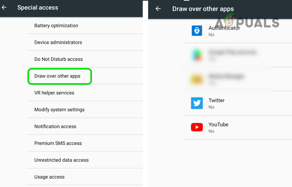 Click on the Gear Icon in the Application Manager - Then select Draw Over Other Apps & make sure no app is permitted to draw over other apps.
