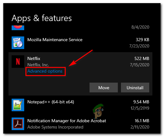 - After you’re inside the Apps & Features menu, go ahead and scroll down through the list of installed applications and locate the Netflix app.