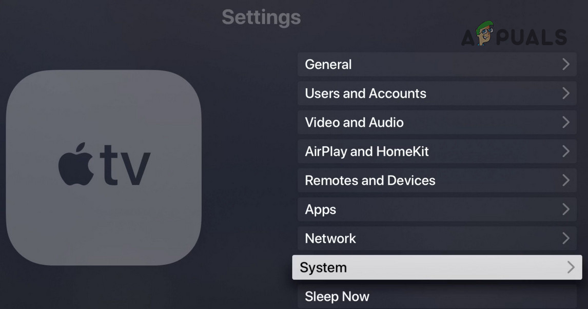 - Open the Apple TV Settings and select System.