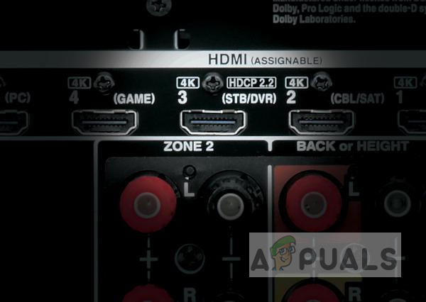 If your AV receiver is HDCP 2.2 compliant then you should see the HDCP 2.2 label on the HDMI port as shown in the below picture.