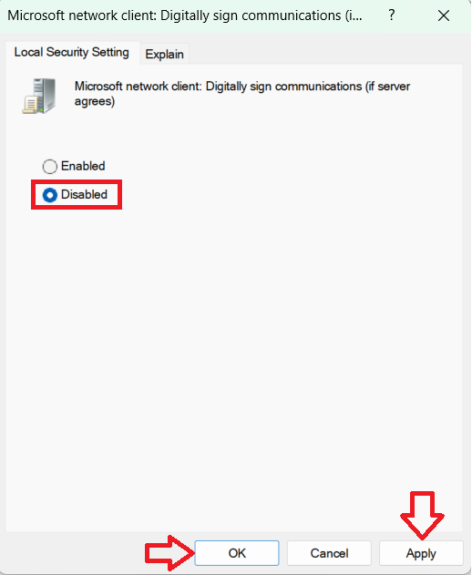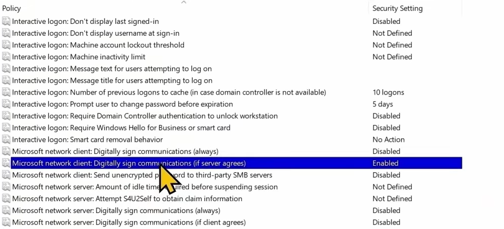 - Then double-click Microsoft network client: Digitally sign communications (if server agrees) and set it to Disabled as well.