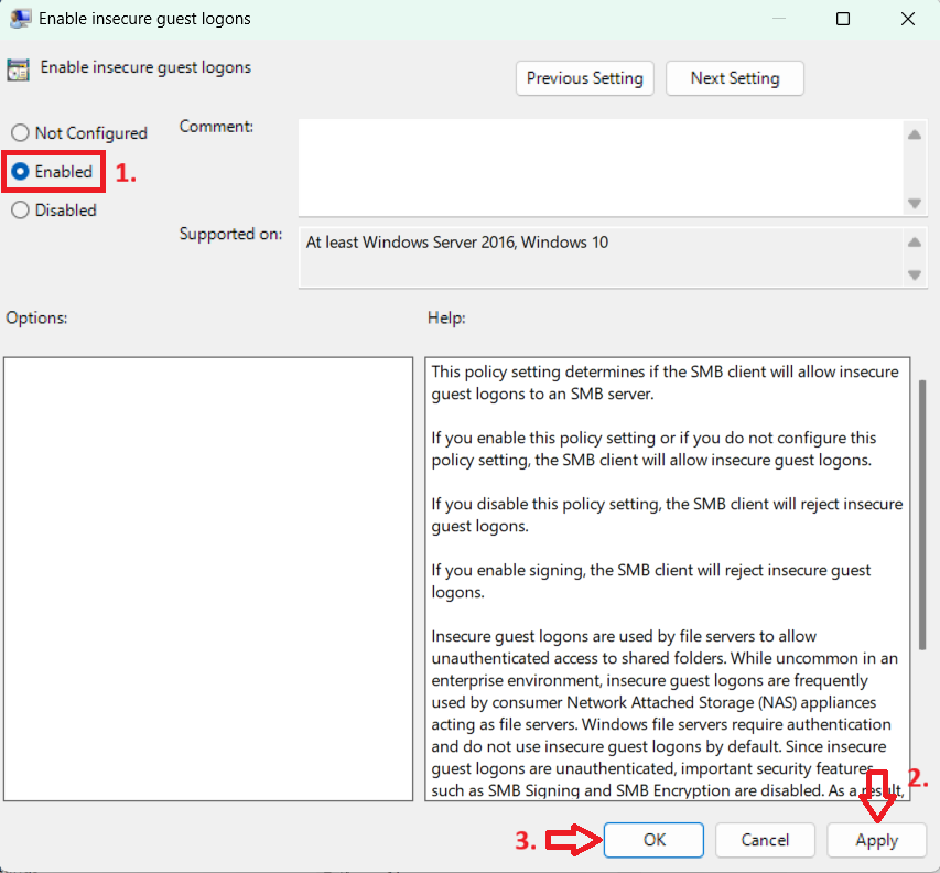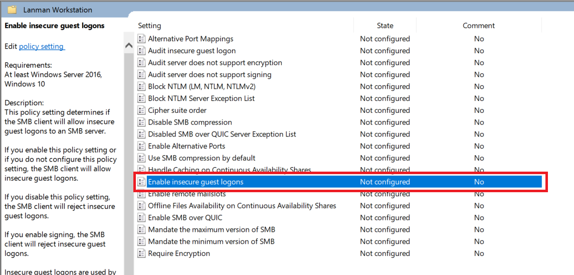 1. Enable Insecure Guest Logons in Group Policy Editor