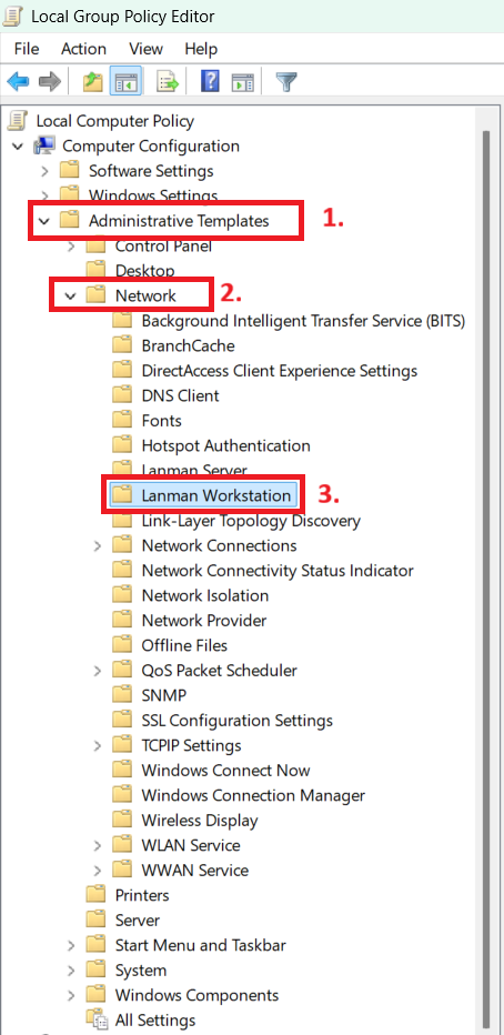 - Navigate to Administrative Templates > Network > Lanman Workstation.