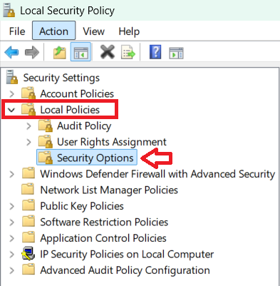 - Open Local Policies then double-click Security Options.