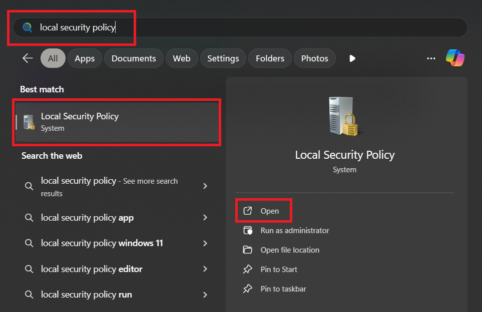 - Search for Local Security Policy and open it.