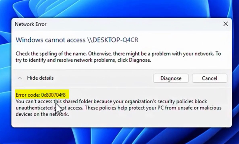 The “Network Error code: 0x800704f8” appears when Windows blocks your attempt to access a shared file or folder on a network. When this happens, Windows displays the message: