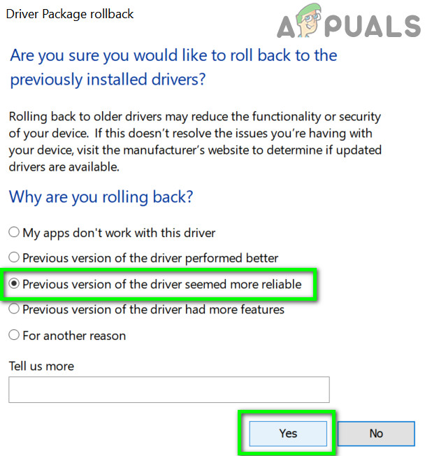 Click on Yes to Roll Back the Driver - Now, wait for the completion of the rollback process. If there is no roll back button available, you should download the older version from the manufacturer’s website and uninstall the currently installed version.