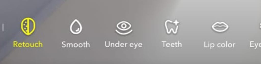 Snapchat has recently added a new set of selfie options that allow users to retouch their appearance in various ways before taking a photo. As shown below, the new settings include Retouch, Smooth, Under Eye, Teeth, Lip Color, Eyelashes, and Auto.