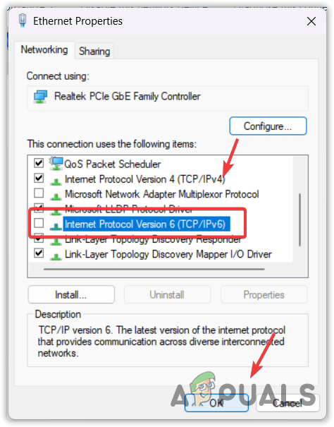 - Within the list, locate and uncheck Internet Protocol Version 6 (TCP/IPv6).