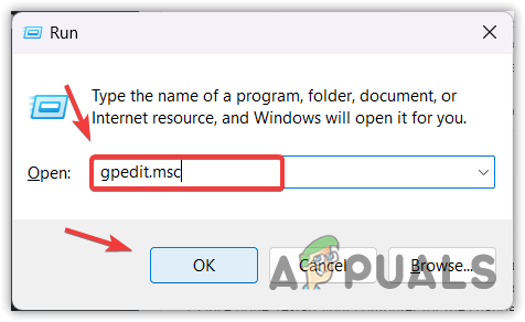 - Type gpedit.msc in the input box and click OK to navigate into the Group Policy Editor.