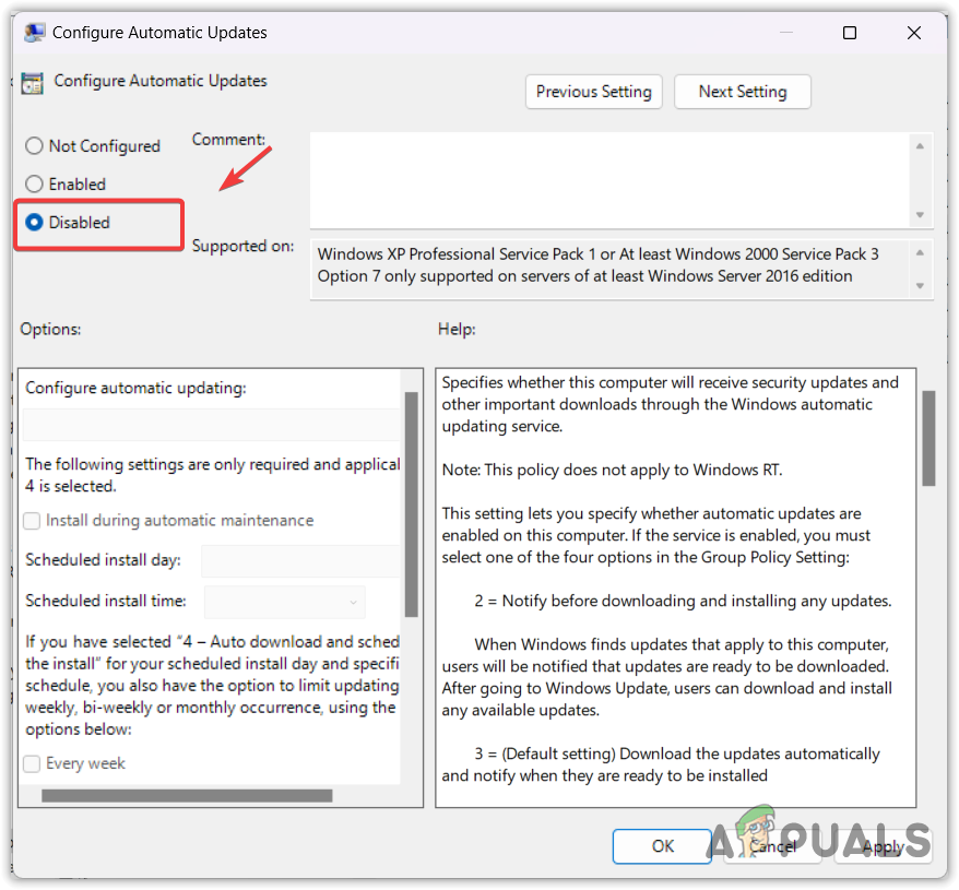- Here, double-click Configure Automatic Updates and select Disabled.