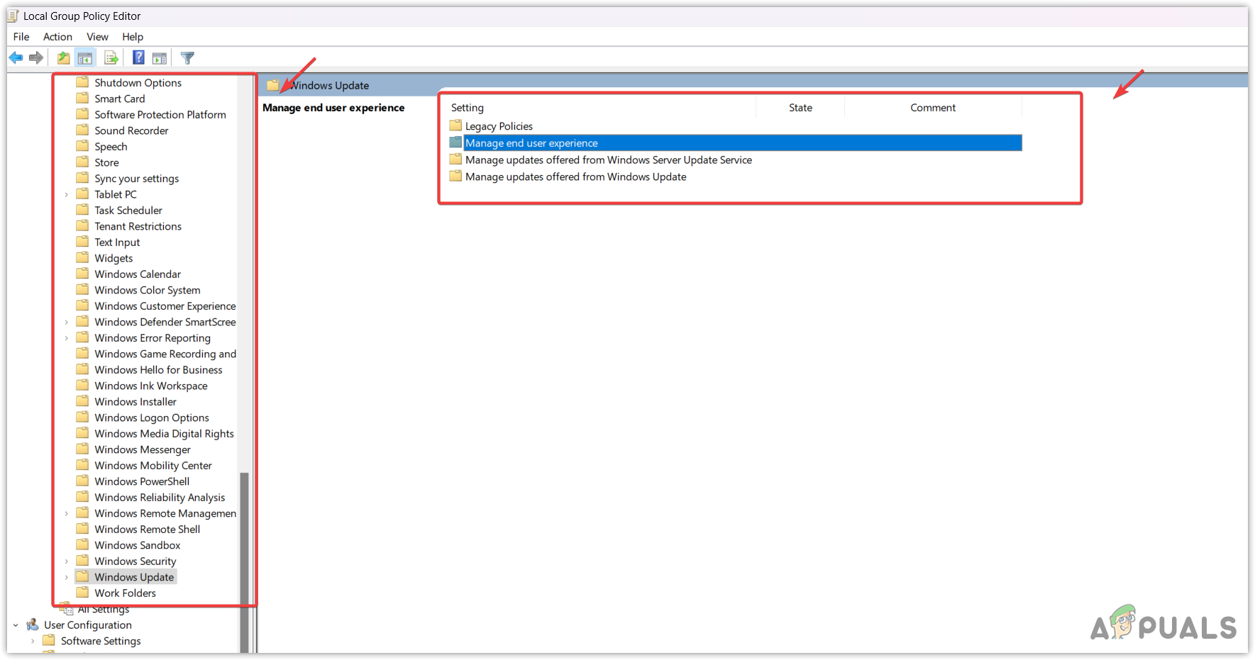 - In the Group Policy Editor, go to Computer Configuration > Administrative Templates > Windows Components > Windows Update.