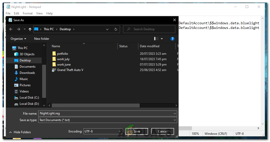 The Night Light script pasted in Notepad. - Click on “file”, select “Save as” and save it as: