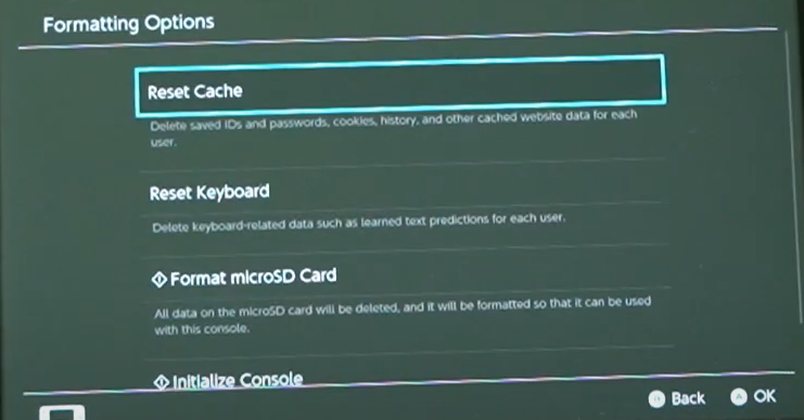Reset Cache of Nintendo Switch - After resetting, click OK and check if the game card issue is resolved.