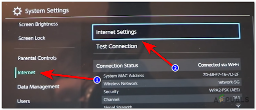 Accessing the Internet settings menu on Nintendo Switch - Choose the network you’re using and select Change Settings.